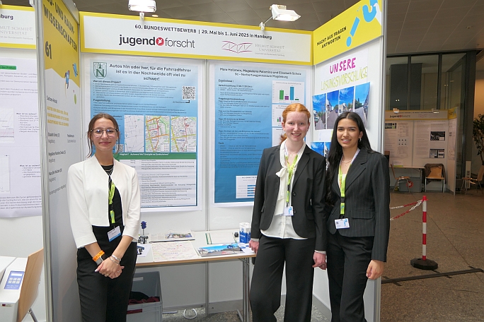Elisabeth Scholz, Magdalena Palomino Oviedo und Mara Sirin Hollstein (Nobertusgymnasium Magdeburg / Sachsen-Anhalt) erhielten für ihre Arbeit „Autos hin oder her, für die Fahrradfahrer ist es in der Nachtweide viel zu schwer“ den Sonderpreis des VDSG. Der Autoverkehr vor dem Nobertusgymnasium in Magdeburg gefährdet Schüler*innen, die mit dem Fahrrad unterwegs sind. Die Jungforscherinnen analysierten deshalb die Verkehrssituation im Detail. Sie zählten Radfahrer und Autos, befragten Schulkinder sowie Lehrkräfte nach ihren Fahrgewohnheiten und analysierten die bestehenden Verkehrswege. Dann glichen sie ihre Ergebnisse mit der Straßenverkehrsordnung ab und kamen zu dem Ergebnis, dass der vorhandene Gehweg rein formal auch für Radfahrer freigegeben werden könnte. Zudem wäre auch die Umwidmung der Straße zur Fahrradstraße mit zugelassenem Kfz-Verkehr möglich. Greift die Stadt die Ergebnisse der drei Jungforscherinnen auf, hätten sie für die Verkehrssicherheit an ihrer Schule viel erreicht.